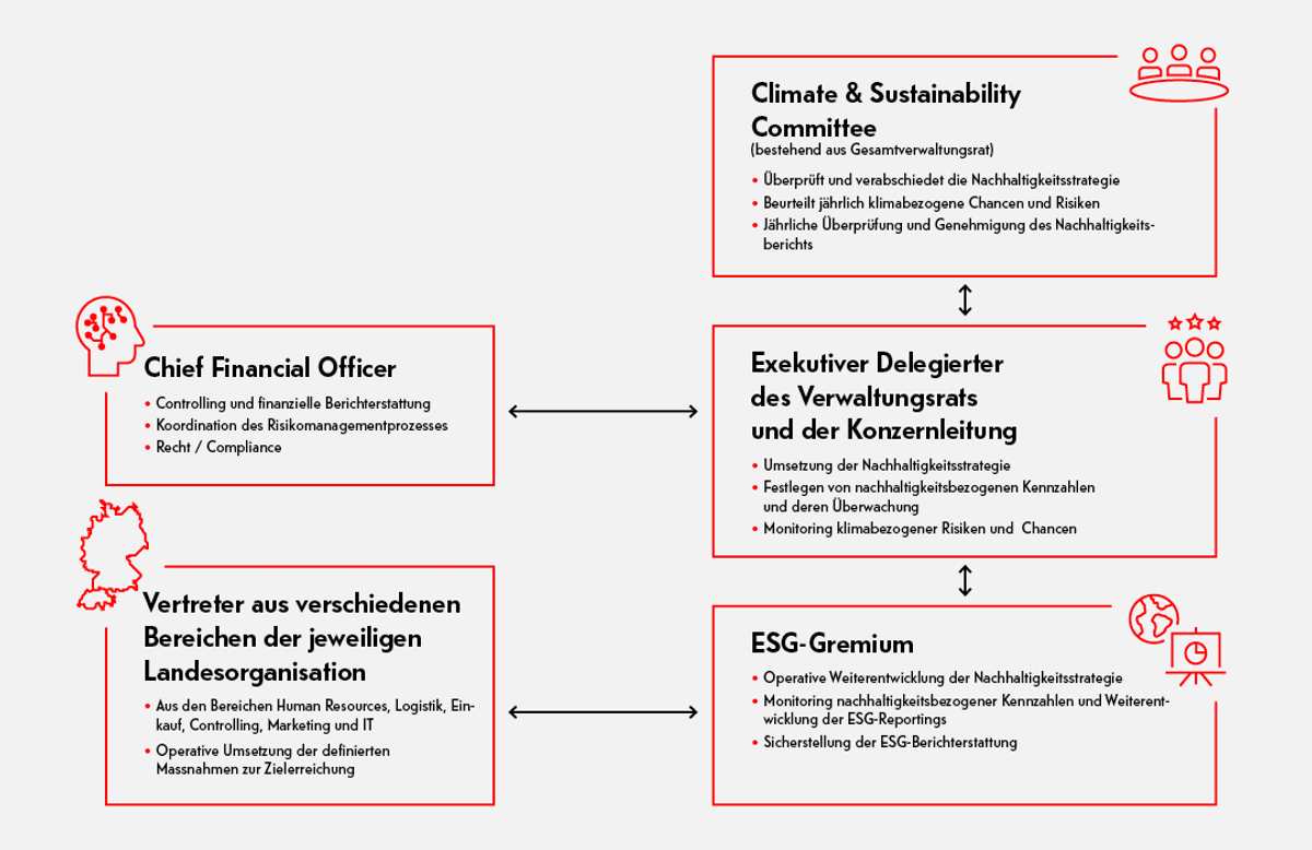 Um das Thema Nachhaltigkeit operativ im Unternehmen voranzutreiben, wurde ein ESG-Gremium, bestehend aus Mitarbeitenden und Führungspersonen der deutschen und der Schweizer Organisation gegründet, welches die operative Weiterentwicklung der Nachhaltigkeitsstrategie, die Entwicklung einer Roadmap, die Sammlung von Nachhaltigkeitsthemen in der Organisation und die Definition der Wichtigkeit der Themen sowie die Entwicklung einer Kommunikationsstrategie für das Thema Nachhaltigkeit und das Monitoring und Reporting an die Konzernleitung zum Zweck hat. Zudem ist es Anlaufstelle für Mitarbeitende. Es findet ein regelmässiger Austausch zwischen der Konzernleitung und dem ESG-Gremium statt sowie mit dem ESG-Gremium und den Verantwortlichen aus dem Business beider Länder.